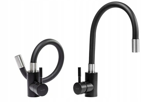 - Bateria kuchenna Clever wykonana z mosiądzu, w czarnym macie z srebrnymi akcentami. Elastyczna, wyginana wylewka i ceramiczna głowica zapewniają wygodę i precyzję. Czarna powłoka gwarantuje trwałość, a minimalistyczny design pasuje do każdej kuchni.