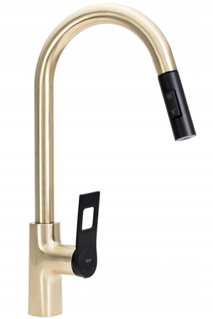 - Elegancka bateria kuchenna ze szczotkowanego złota, wykonana z mosiądzu i ceramiki. Odporna na zarysowania, łatwa w czyszczeniu i montażu. Wyciągana wylewka umożliwia skierowanie strumienia w dowolne miejsce, dodając wnętrzu stylu i funkcjonalności.
