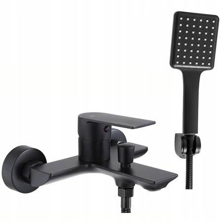 Bateria wannowa Urban z uchwytem i słuchawką w czarnym kolorze to funkcjonalny i trwały zestaw wannowy montowany na ścianie.