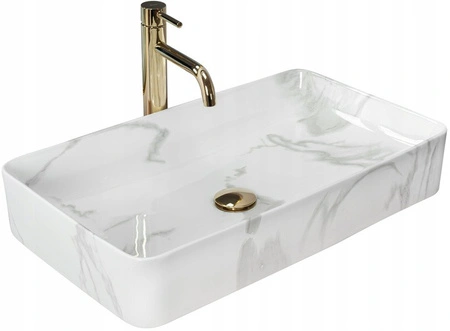 - Umywalka Desni Marmo Shiny to elegancki model nablatowy z ceramiki sanitarnej wykończony wzorem imitującym naturalny marmur. Prostokątny kształt, cienkie ścianki i trwałość zapewniają styl i wygodę na lata, przyciągając uwagę w każdej łazience.
