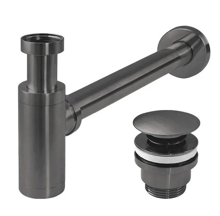 Stylowy syfon z korkiem Klik-Klak w eleganckim kolorze tytanowym to połączenie funkcjonalności, nowoczesnego designu i trwałości. Wykonany z wysokiej jakości mosiądzu, został pokryty odporną powłoką PVD, która gwarantuje długowieczność, odporność na korozję oraz zachowanie idealnego koloru przez lata.