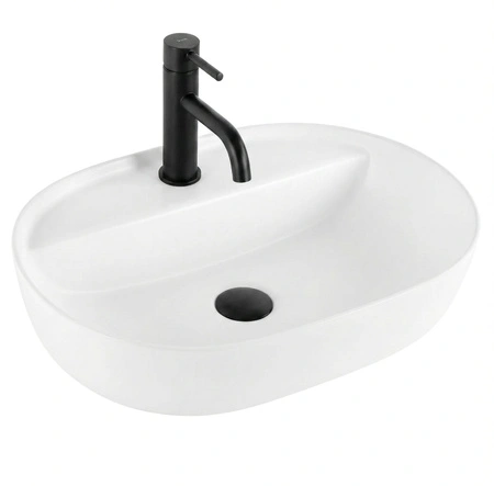 - Umywalka nablatowa Rea Aura 51 White Matt: nowoczesny owalny design i eleganckie matowe wykończenie. Wykonana z wysokiej jakości ceramiki, posiada praktyczny otwór na baterię. Trwała, łatwa w czyszczeniu i stylowa.