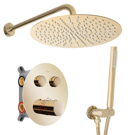 - Zestaw natryskowy podtynkowy Lungo z termostatem to idealne połączenie elegancji i wygody. Złote wykończenie, ultra cienka deszczownica (2 mm), dysze anti-calc i termostat gwarantują stylowy wygląd oraz komfort i stałą temperaturę kąpieli.