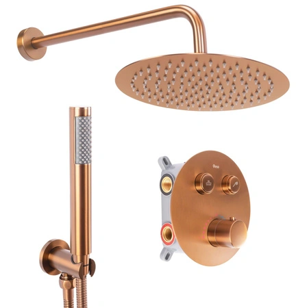 - Zestaw natryskowy podtynkowy Lungo z termostatem to idealne połączenie elegancji i wygody. Miedziane wykończenie, ultra cienka deszczownica (2 mm), dysze anti-calc i termostat gwarantują stylowy wygląd oraz komfort i stałą temperaturę kąpieli.