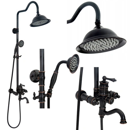 - Zestaw natryskowy Vintage Old Black w stylu retro wyróżnia się czarno-miedzianym wykończeniem, klasycznymi zaworami i unikalnym kształtem deszczownicy. Posiada dysze Anti-Calc, ceramiczne głowice oraz w komplecie deszczownicę, słuchawkę i wylewkę.
